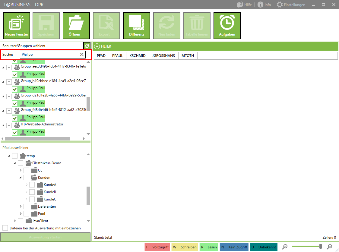 Hiermit können Sie spezifische Rechte komplett ein- oder ausblenden. Möchten nur Ergebnisse mit Vollzugriff sehen? Ein klick hierauf und die Abfrage wird nach ihren wünschen gefiltert.