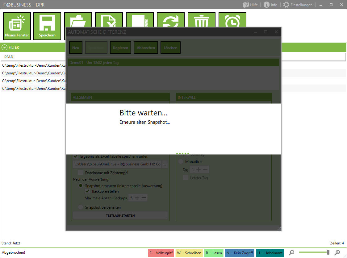 Die Funktion "Differenz" vergleicht für Sie die Rechte eines gespeicherten Standes mit den aktuellen Rechten. Dabei werden nur die Pfade und Ordner geprüft welche in der Abfrage gespeichert wurden.